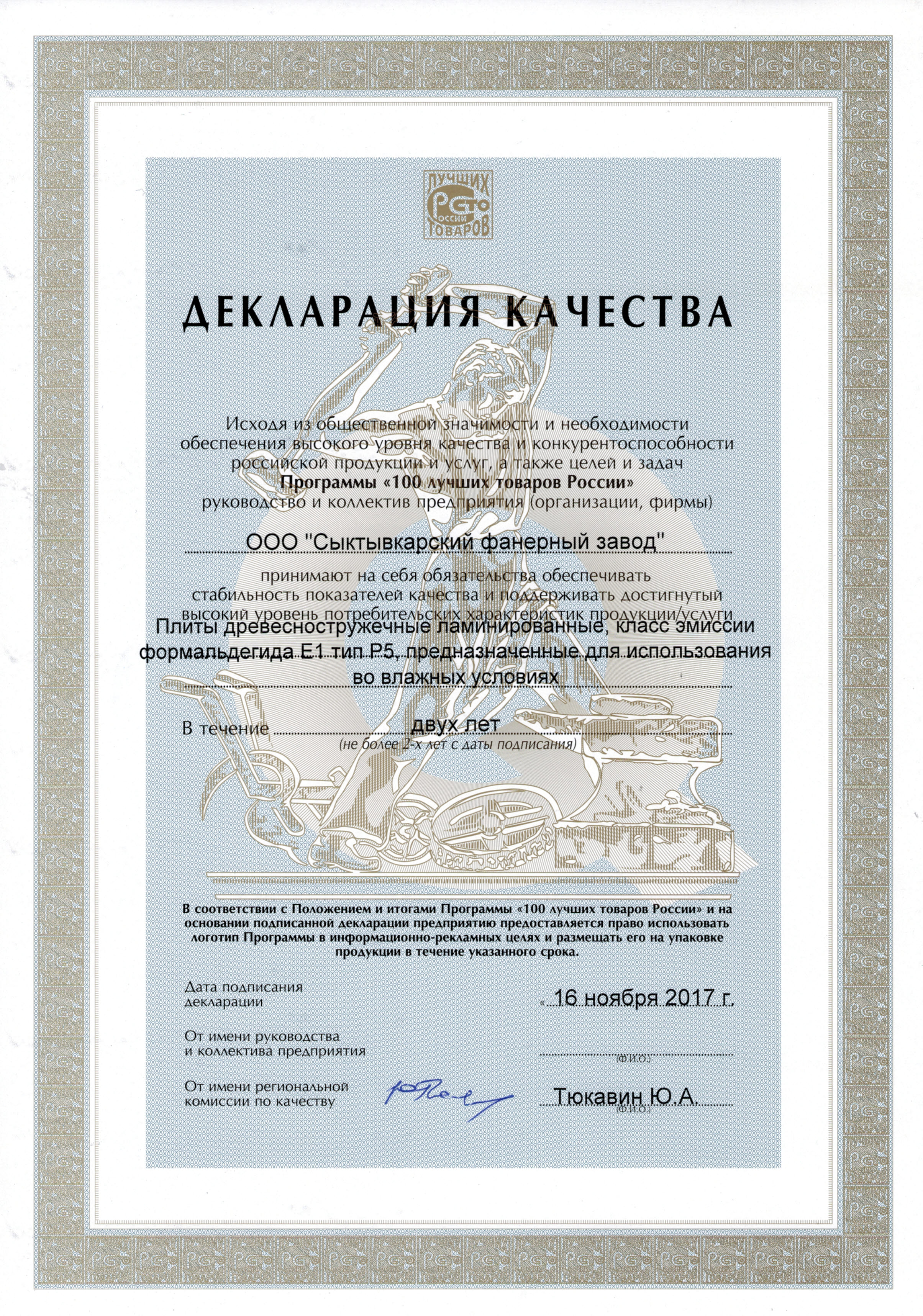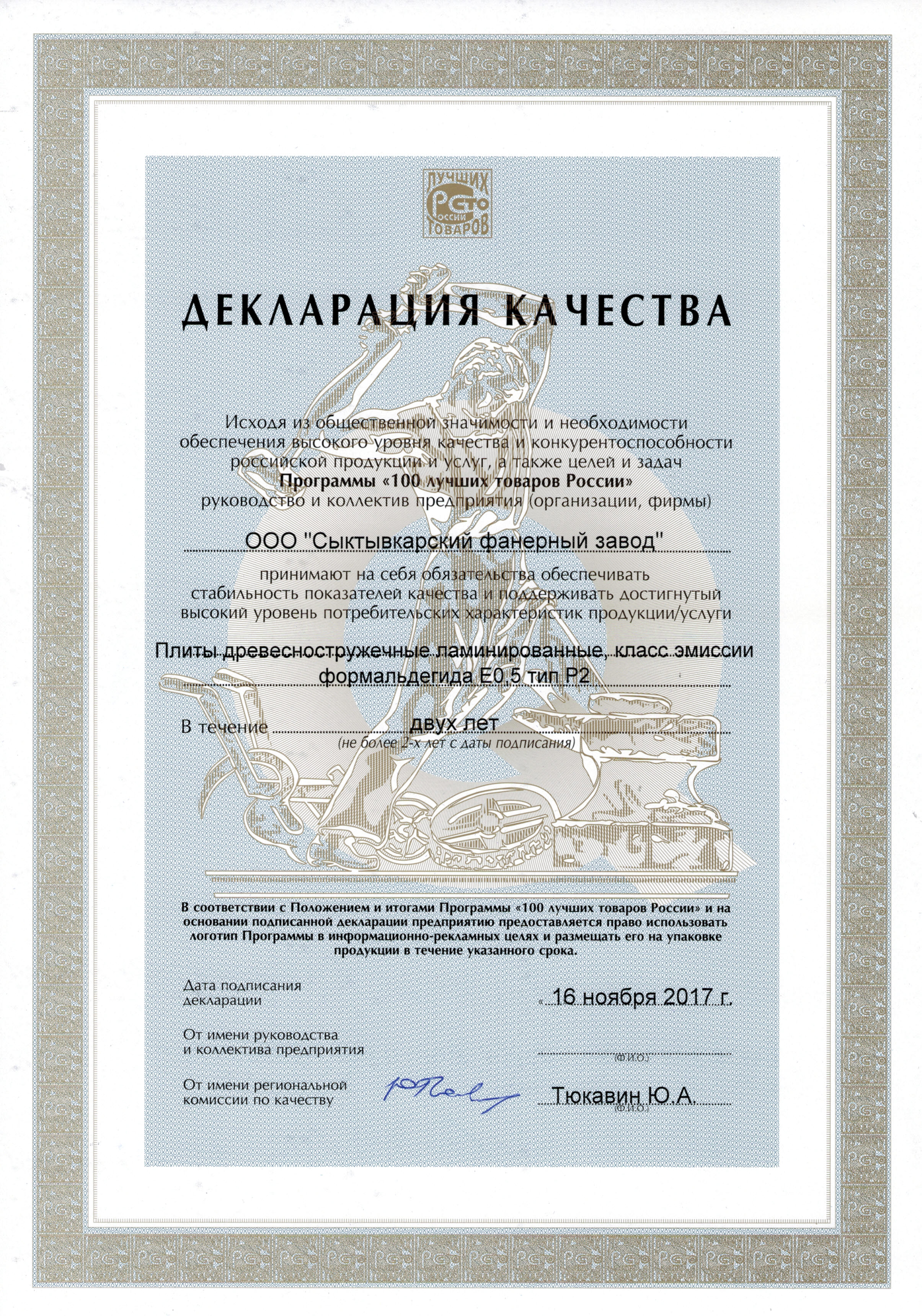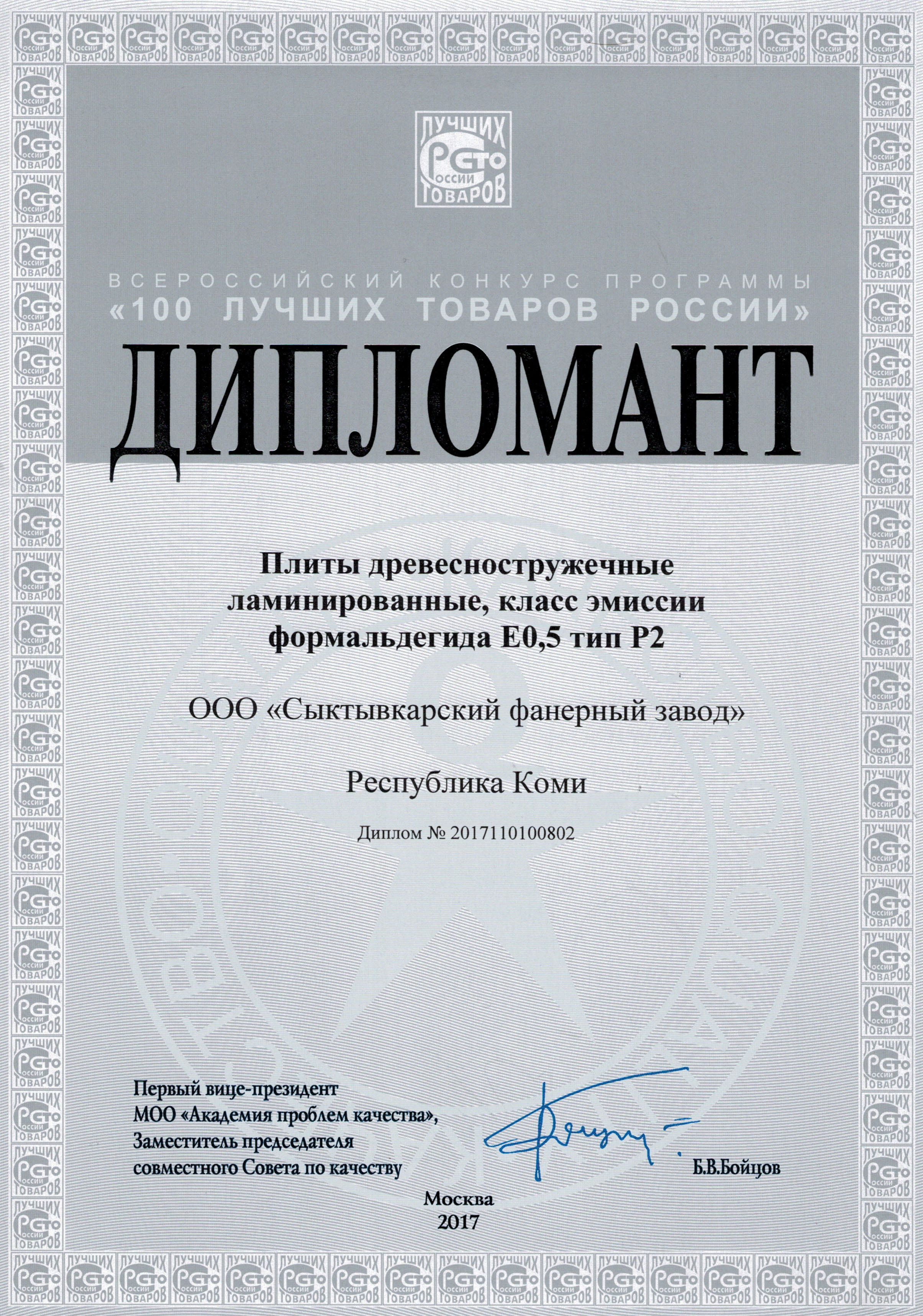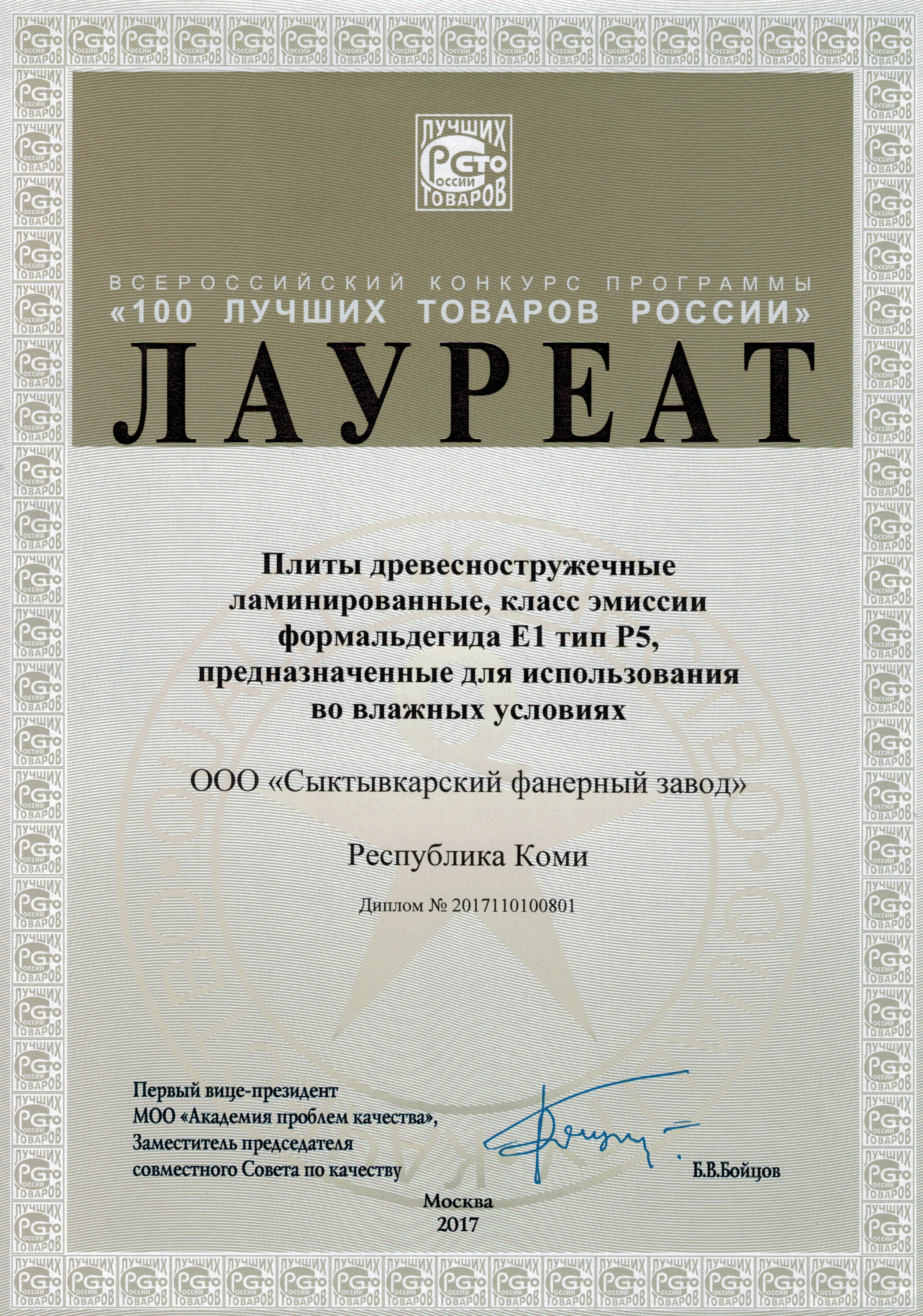 Диплом лауреата вручается финалисту всероссийского конкурса программы «100 ЛУЧШИХ ТОВАРОВ РОССИИ» за достижение высоких результатов в улучшении качества и безопасности отечественных товаров (продукции и услуг) – березоваой конструкционной фанеры SyPly.