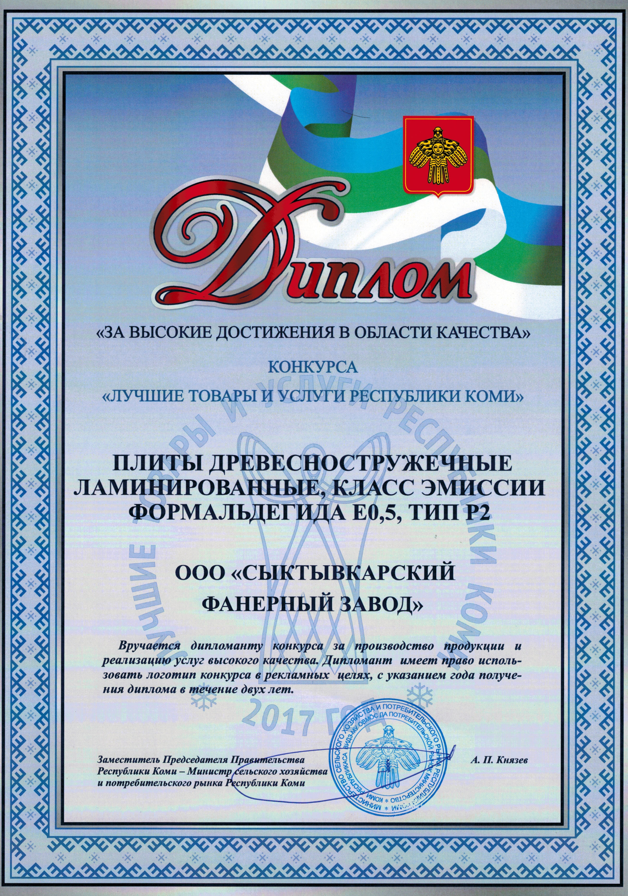 Диплом Лучшие товары и услуги Республики Коми: Плиты древесностружечные ламинированные E0,5, тип Р2