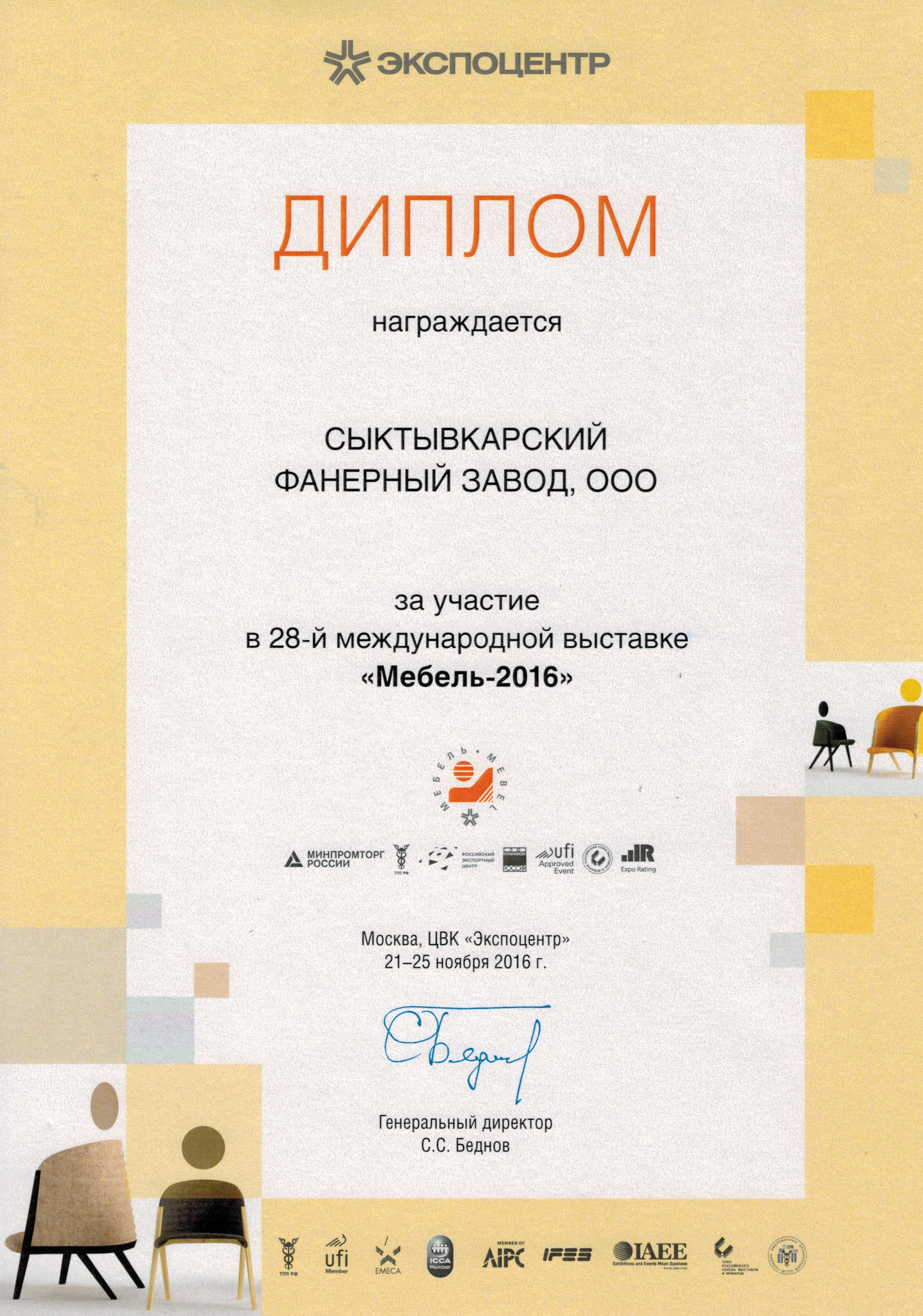 Почетная грамота выдана ООО «Сыктывкаркий фанерный завод». Настоящим мы награждаем Вас как важного партнера г. Арнсберг (Германия). Ваше сотрудничество с фирмой Interprint вносит большой вклад в экономическое развитие Арнсберга. Мы от всей души благодарим Вас.